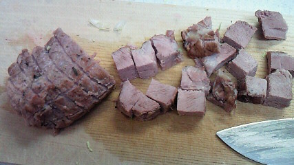 800ml程度の水、肉・ローリエ・クローブ・黒胡椒を入れ圧力鍋で12分位煮る。