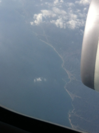 雲の切れ間から韓国の海岸線が見えました。