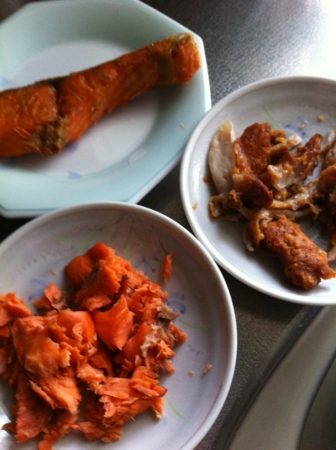 冷凍庫にはチキチキボーンと鮭の切り身を常備しています。