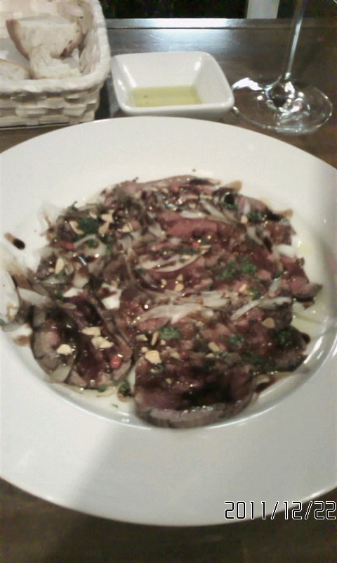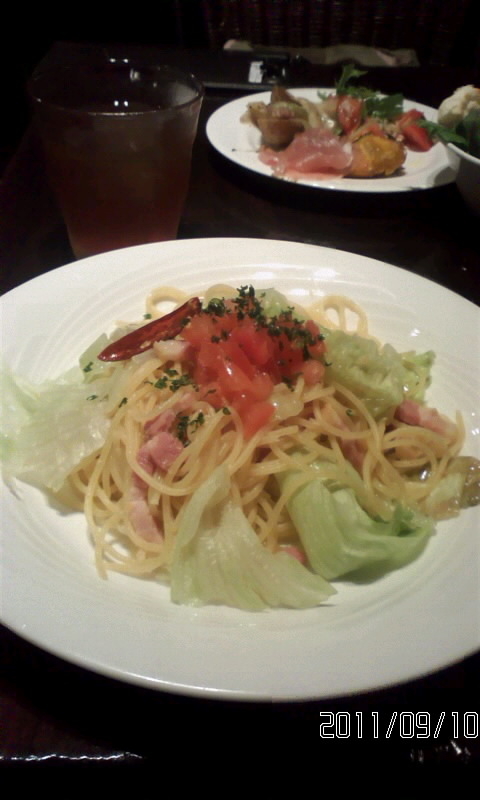 マグロのサラダ(というよりレアステーキ?!)と魚貝+青菜ラグーパスタは、