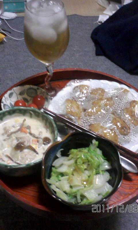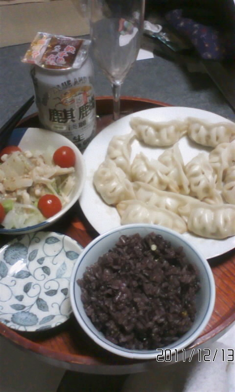 焼き餃子、白菜とえのきのレンジ蒸し@ごま豆乳ドレッシングがけ、古代米、淡麗生。