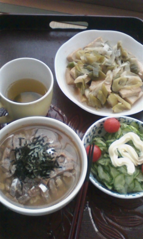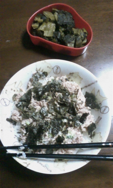 今回は長ねぎで、焼き海苔かけてみた。高菜漬けつき。