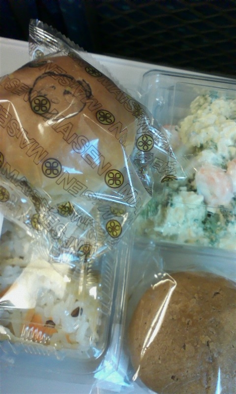 パンダヒレかつバーガー@まい泉、五目いなり、海老とブロッコリーのサラダ、塩キャラメルマッキアートウーピーパイ。