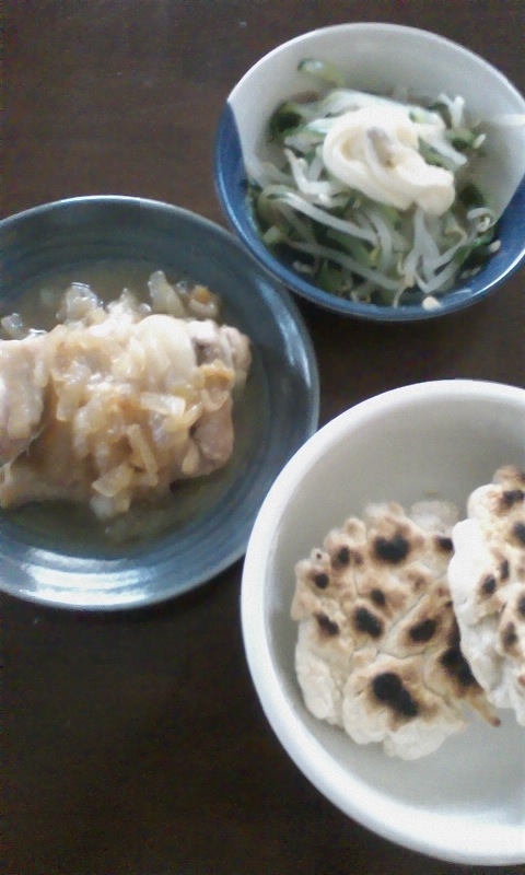 鶏肉のマーマレード煮、平焼きパン、もやしきゅうり蒸し辛子マヨネーズ添え。