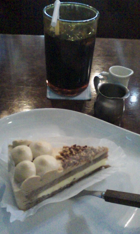 ランチセットのビーフシチューグラタン、サラダ、ドリンク(アイスコーヒー)+塩キャラメルケーキ。