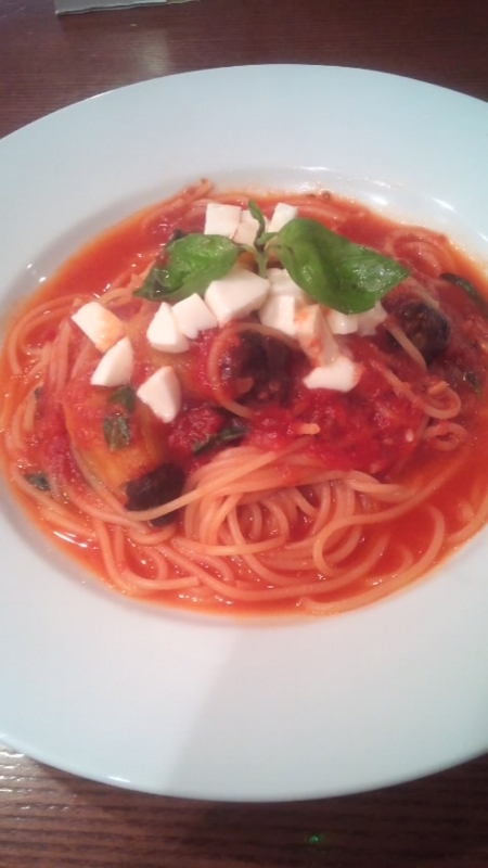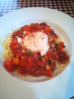 「フレッシュトマトの辛口ミートソース」をカルボナーラで。という料理名。
