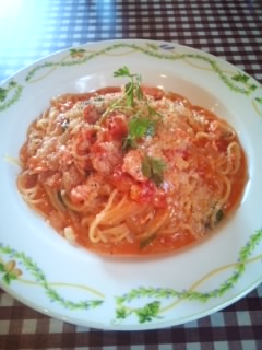 サーモンと菜の花のクリームトマトソース。激ウマ。