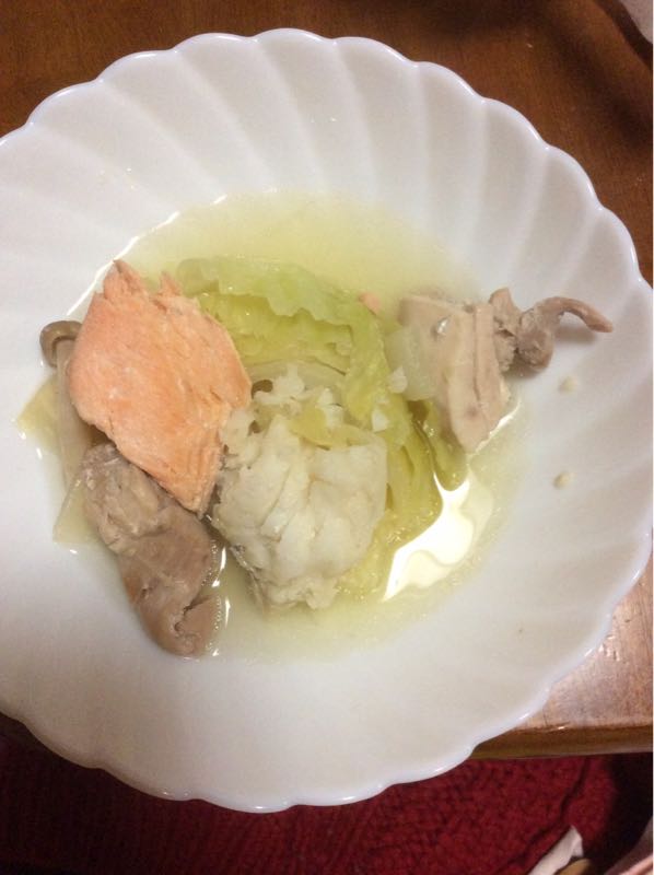 うちにあるすべての生野菜ときのこと解凍たんぱく質(鶏もも・サーモン・たら)を鍋にぶち込んで日本酒だけで煮たやつ‼︎(盛り付け例)