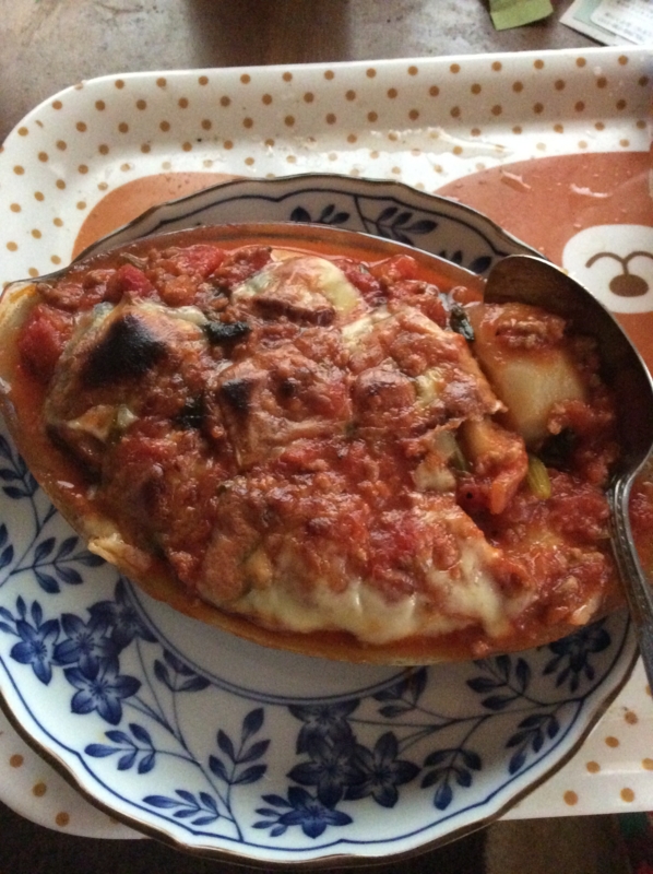 トマト缶になす、きのこ類、ツナ缶を入れた在庫整理的一品