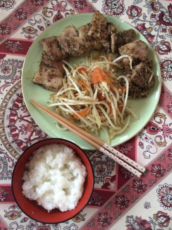 お昼、料理男子ハイカーの真似をして塊肉スライスし、サムギョプサル‼︎