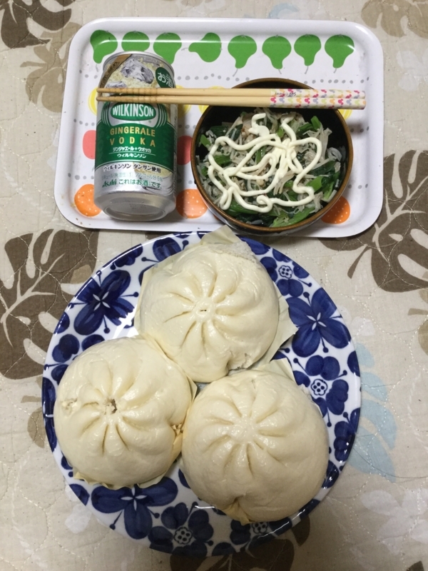 肉まん@紀文のストック、小松菜+えのき蒸しマヨポン酢