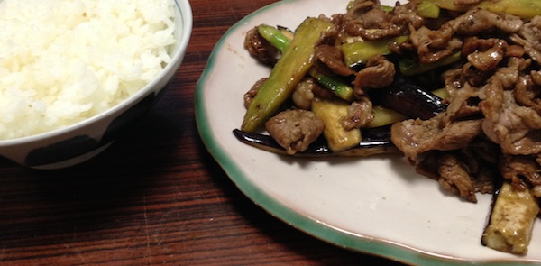 ラム肉とカリフラワーの茎と茄子炒めで遅い昼食