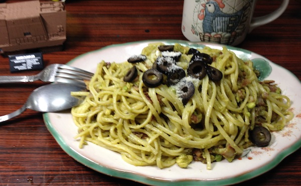 深夜に食べたくなったペースト・ジェノベーゼのパスタは、インスタントバジルソースの茹でうどんという形になりました。