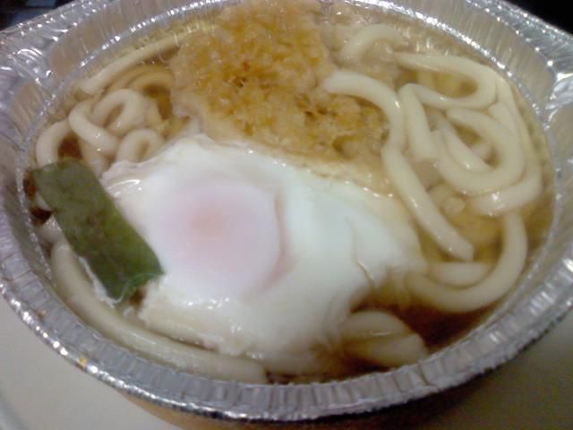 朝は、行きつけのスーパーでよく買う、天ぷら鍋焼きうどん。卵は自前。