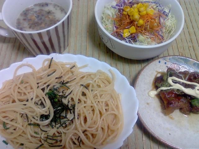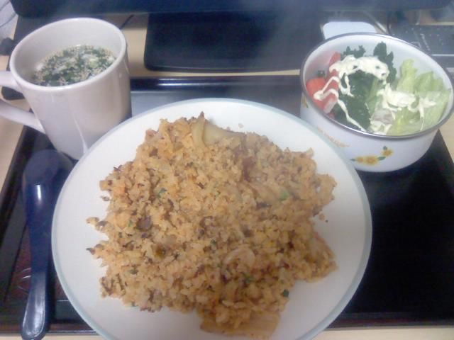 カット野菜を盛ったサラダ、即席スープ、スーパー惣菜の鶏、保切れたたらこキユーピー+ねぎ。4か月過ぎでしたが、味に問題なし。