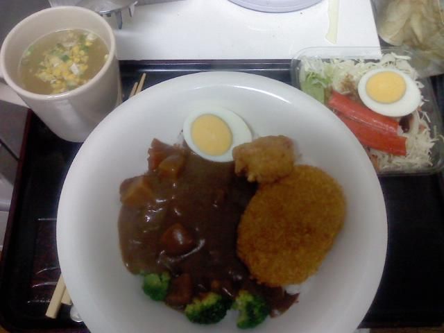 カレーはレトルトの特売、揚げ物とサラダは見切り品、ごはんとブロッコリーは冷凍品。