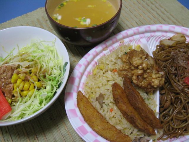 ジャンキーな見切り弁当にサラダ。明日の朝も見切り弁当。