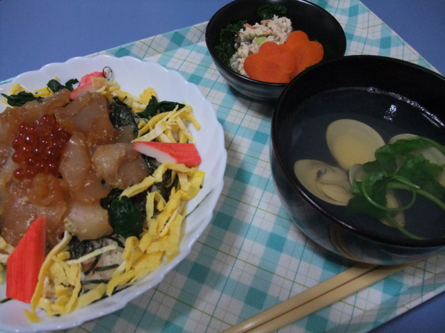 ひな祭りなので、それらしいメニュー。カミさんは娘を寝かしつけ中なので、一人で。娘は、はまぐりはもちろん、すまし汁も全く飲まなかったみたい。まだ生臭いかな。