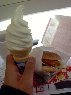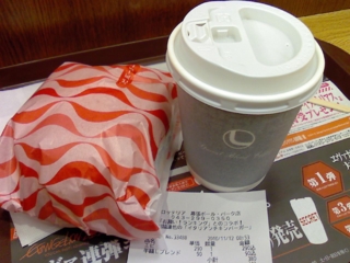 マリーンズ優勝セールにありついた。しかも、お膝元・海浜幕張オフィシャルショップ隣のロッテリアだよ!レジも、レプリカユニフォームのお姉さん。