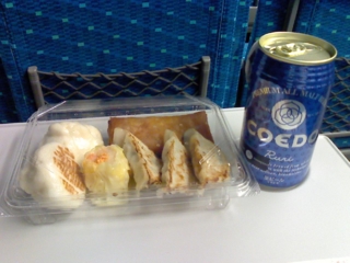 東海道新幹線なう。グランスタで点心盛りとコエドビール瑠璃。