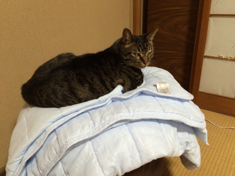 さっきまで朝から…と言うより夜からずっと本箱の上で寝ていた猫。しばらく前にようやく起きて人の膝に乗ったりしていたかと思えば、今は姿が見えず。どこ行ったのかと探すと、さっきまで私がエアコンつけて休んでいた寝室に行ってた。エアコンつけたまま来たからな。