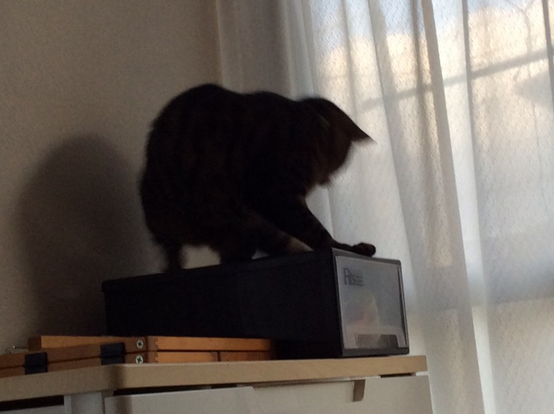 ちゃっかり引き出しが開いた隙間にもぐり込んでいる。