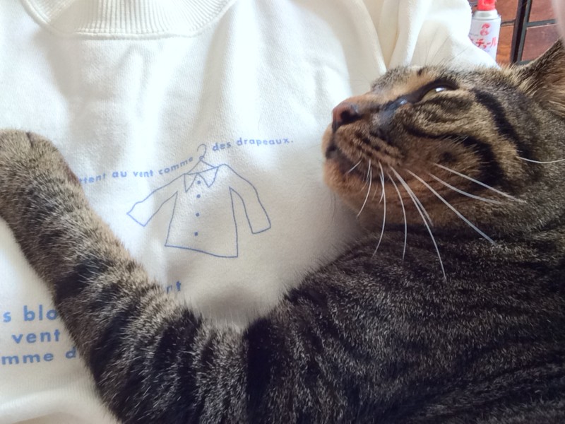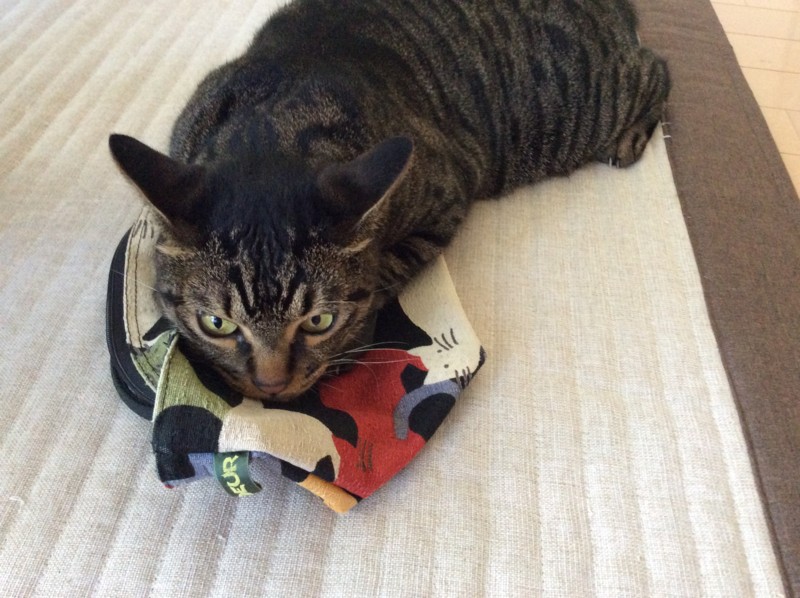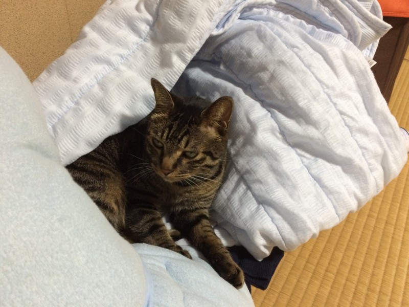また猫が見当たらんと探したら、寝室で畳んで置いてあった台の上からお布団を落として、自分の巣にしていた。