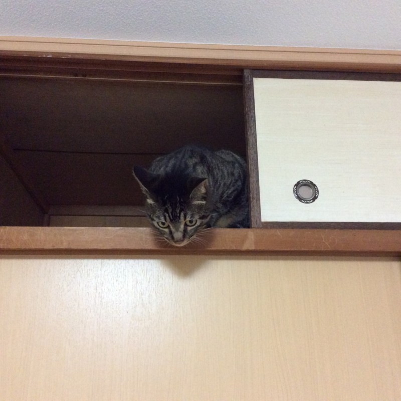 なんか上の方から猫の寝息みたいなのが聞こえるので脚立に上って見てみると、天袋の中でくつろいでいる猫。