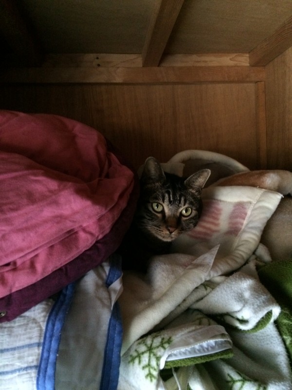 2階の押入れを勝手に開けて、冬用のカバー類や毛布、綿入れ半纏など積んであったのを適当に動かして、自分の巣にしていた模様。