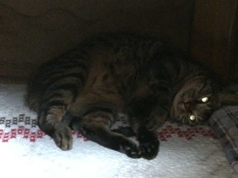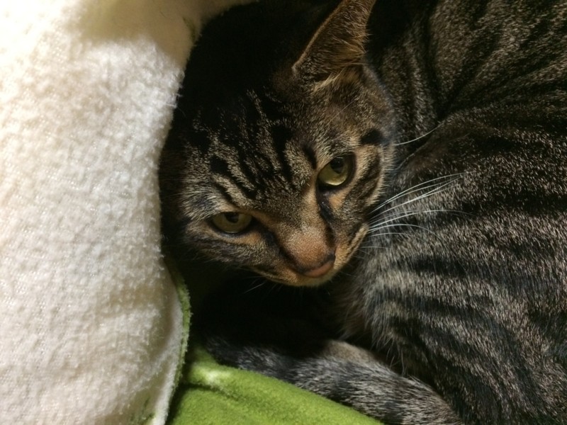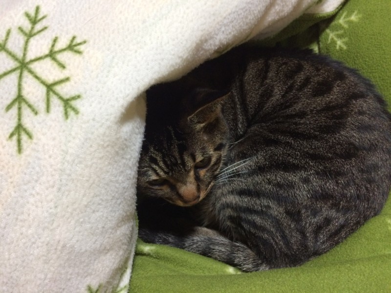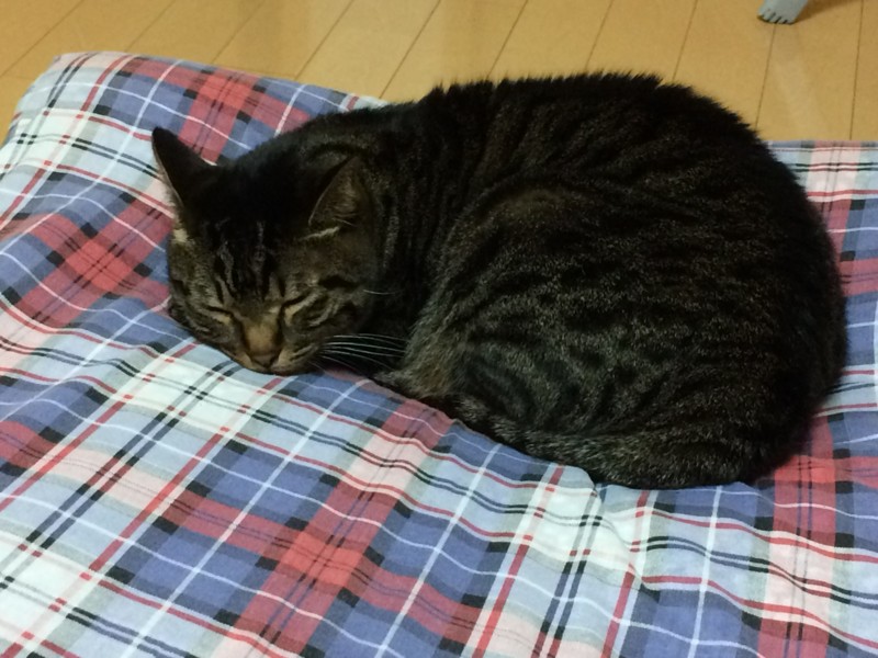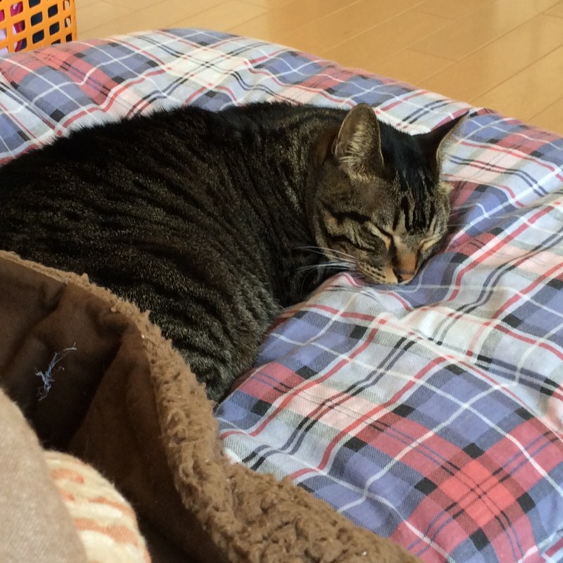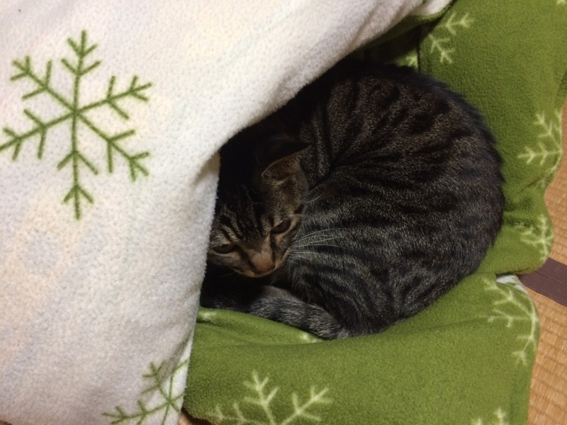 何だろう?とおこた布団をめくって覗いてみると、猫がそれにもたれて寝ていて、びっくりしたような、責めるような目でこちらを見ていた。