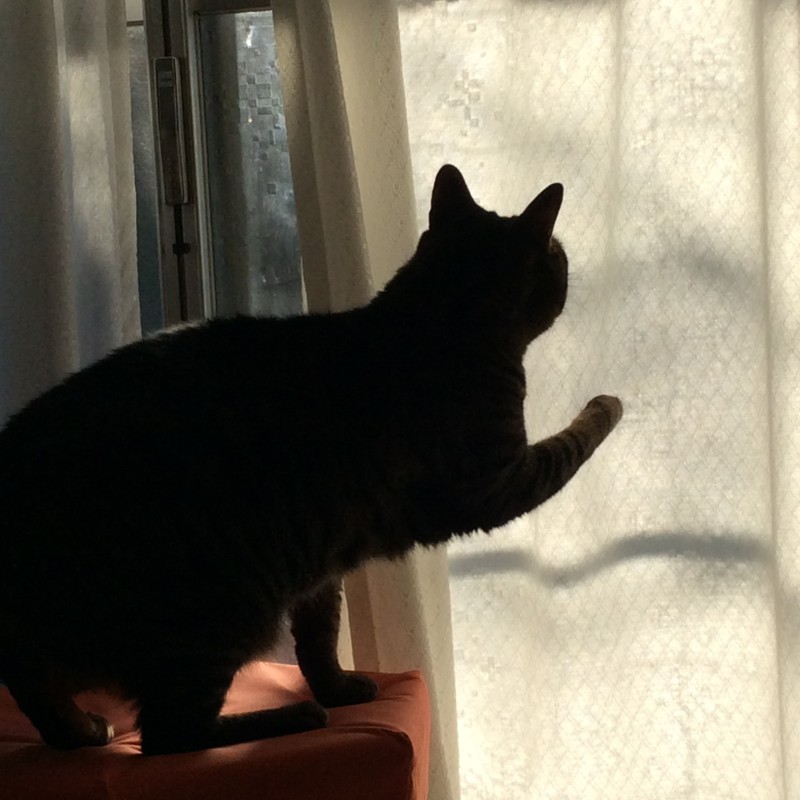 カーテンに映る鳥の影に戦いを挑もうとする。