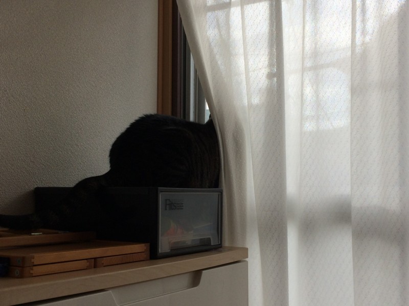 部屋の反対側(台所側)の引戸は、いつも猫が出入りできるように少し開けているからそっちから出入りすればいいのに。