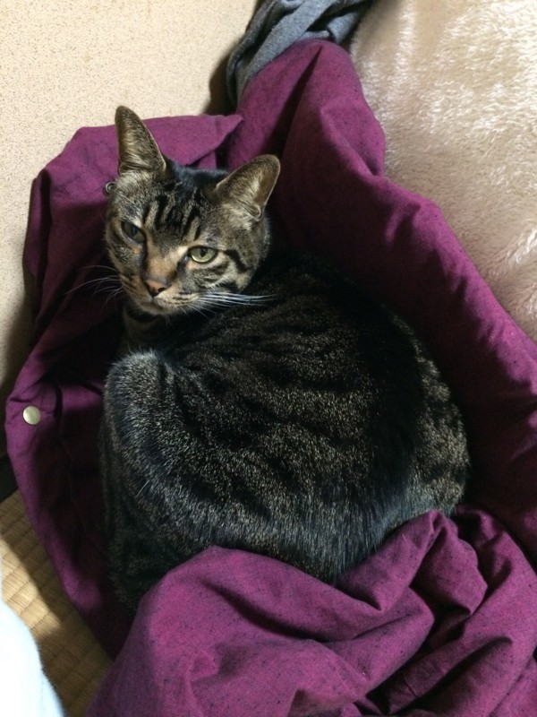 全然使ってくれないので、座布団などとともに椅子の上に積み上げていた猫ベッドを、掃除のついでにいつも乗っている物入れスツールの上に置いてみたら、胡散臭そうにクンカクンカした後で乗ってみている。