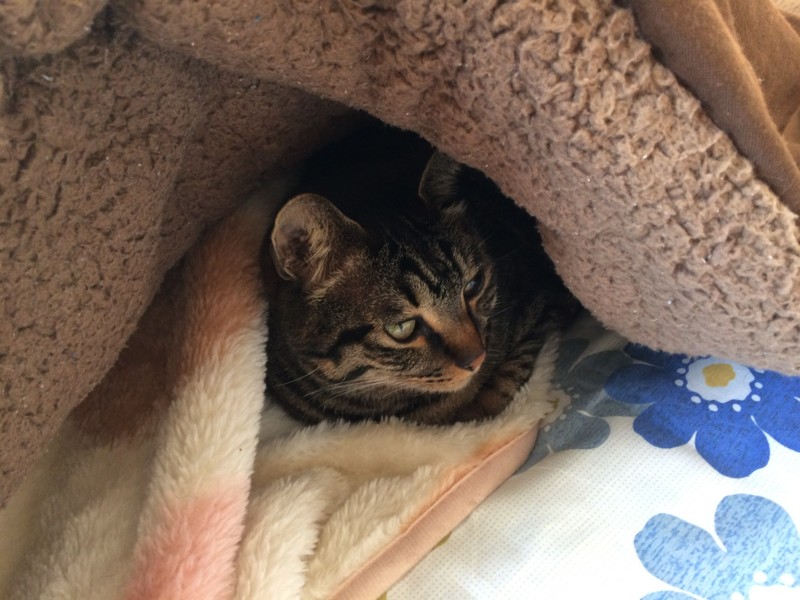 ゴソゴソゴソとおこた(さすがに電気は入れてない)の中にもぐっていったと思ったら、こたつ布団と中掛け毛布の間に挟まって落ち着いていた。