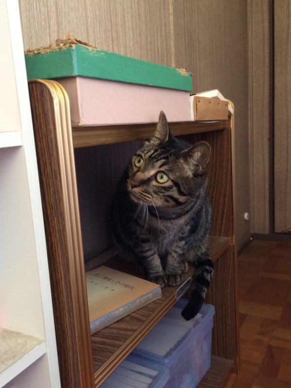 猫いないな。また2階の棚かな、と思ったら、いました。