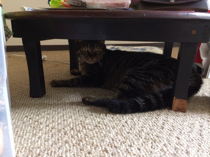 見当たらないと思ったら、こんな低いちゃぶ台の下で寝ていた。