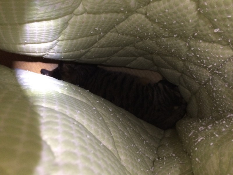 マットの隙間に入って以来、すっかりおとなしくなって私が何をしていても出てこない。