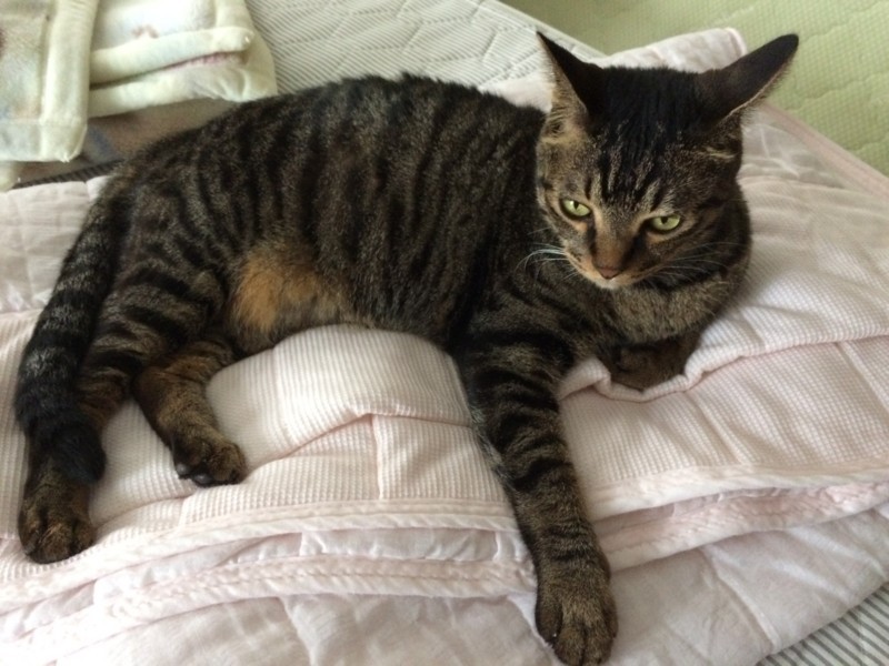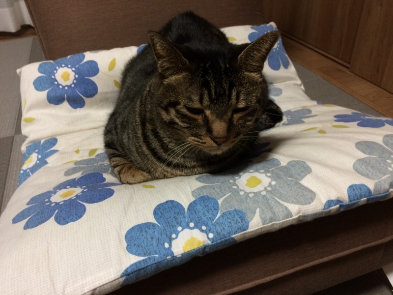 しかし、私はいまだに薄い夏の肌掛けで寝ている。一応夜中に寒くなった時のために足元に毛布を置いているのに、それは完全に猫用になってしまって、たとえ寒くても引っぱり上げられない状態。しかも毛だらけ(^^;