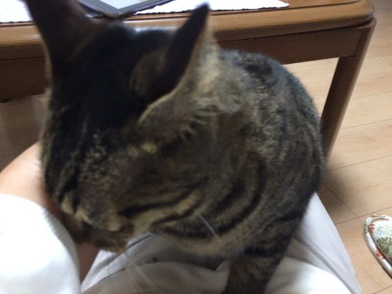 やっと寝室から出てきたと思ったら、膝の上に乗ってきてごろごろ。