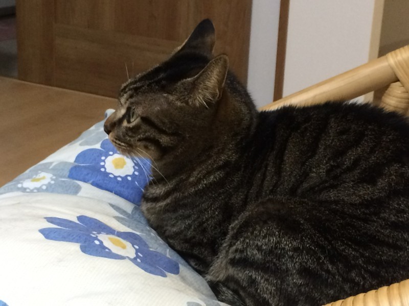 いつもなら私が外出から戻ると大騒ぎで玄関まで出てくるのに、今日は朝の冒険(?)で疲れたのか、ずっと寝ていて、私が部屋に入ってきてもチラッと目を上げるだけ。