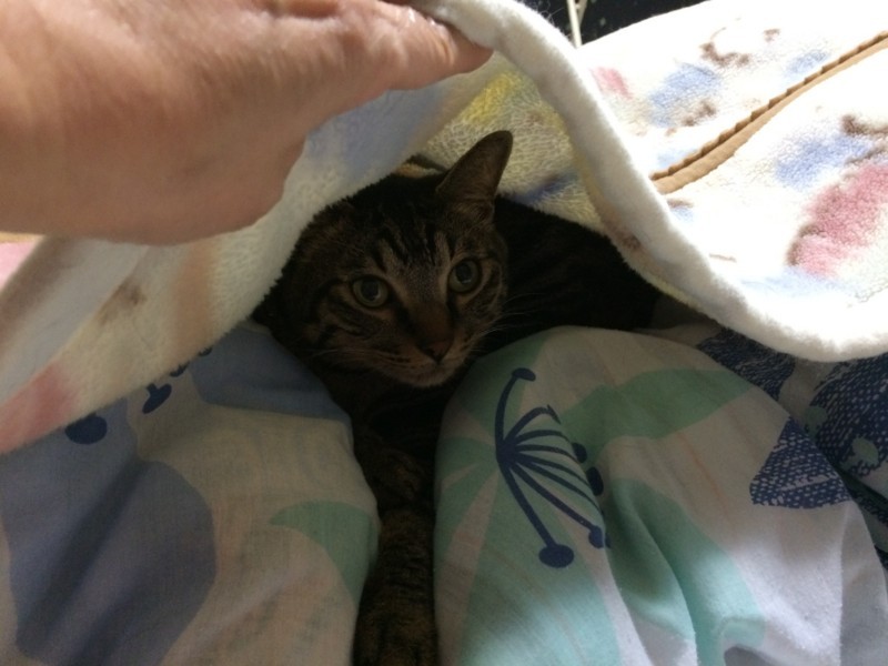 帰ってきたときに見たら、この畳んだお布団の真ん中がぽこんと窪んでいたので、私の留守中ずっとここで寝ていたのは歴然。