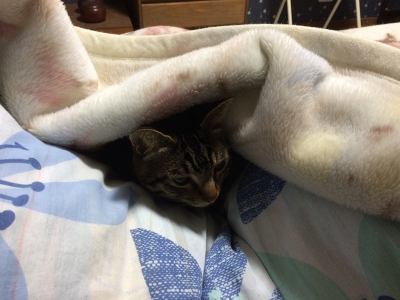 温いおこたの中がよほど気持ちいいのか、まったく出てくる気配がない。