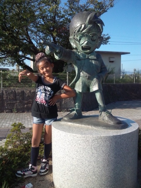 今朝は小学校4年生の女の子を連れて、名探偵コナンの銅像を見に行って来ました。