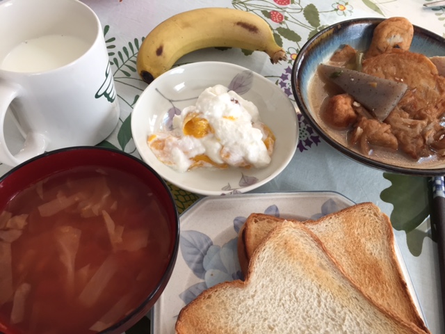今日の朝ごはんは久しぶりのパンにミネストローネにドライフルーツ漬け込みヨーグルトにバナナと牛乳に、おでんでした。おでん?