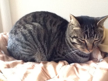 早朝にやって来た猫は、わたしを起こすのかと思いきや、そのままお布団の上で丸くなってしまい、まだ今も寝ています。