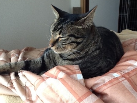 私自身もじゅうぶん寝坊したと思っても、うちの猫は私が起きてきてもまだ自分の寝床の上でぼんやりと寝たまま。それから洗濯機を回したり新聞を取りに行って読んだり、あれこれ30分以上も経ってからようやく起き出して人の膝の上に甘えにきます。