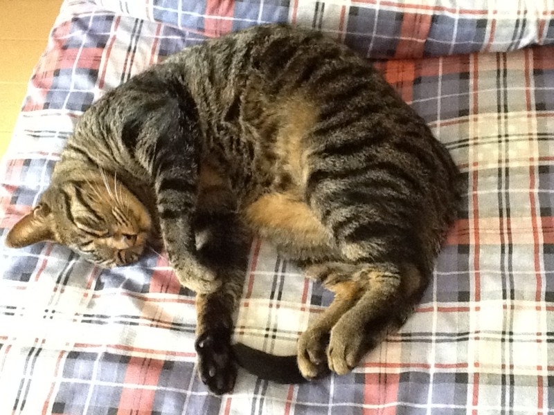 昼間は暑くても、朝は涼しくていくらでも寝られそうな気候になりました。自然体の猫はまだ寝ています。