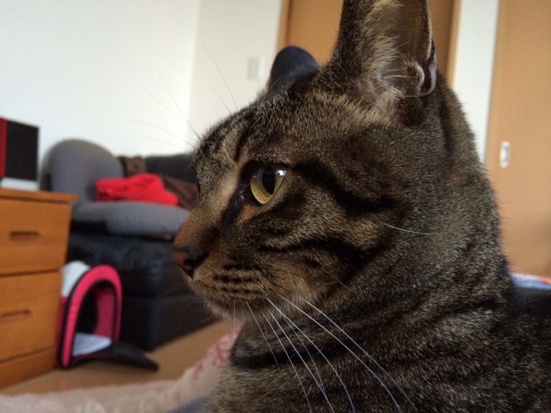 さっきまで寝てました。起きてきたらみい太がさっそく膝に座り込んで動けません。