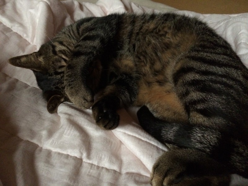 案の定、猫に安眠を妨害された。せっかく気持ち良く寝入ったと思ったら、部屋にやってきてイタズラして起こされ、目が覚めたのでトイレに行ったらウンチ発見。片付けて、今度は猫シャットアウトして寝たら、バリケードを突破して押し入って、しばらく暴れた後毛布の上で寝てた。