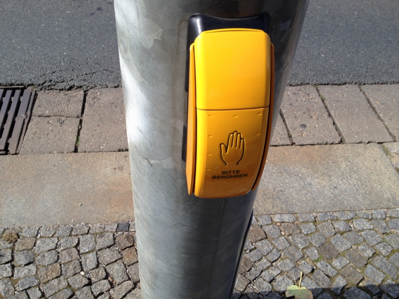 歩行者用信号。ボタンじゃなくて触るタイプ。宗教的に祈るのかてかざしかと思った。